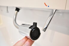 洗面化粧台の水栓は普段はコンパクトに収まっていますが、ヘッドが引き出せるので洗面ボウルを流したりにも便利です。鏡は身だしなみのチェックに便利な三面鏡。裏がキャビネットになっているので細々としたものもスッキリ収まりますね。