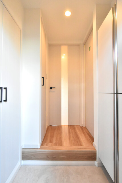 玄関から続くコンパクトなホールはナチュラルカラーのフローリングと白のクロス。黒の金物がいいアクセントになっていますね。上がり口はしっかり高さのあるタイプ。最近はバリアフリーの観点から段差の小さなところも多いのですが、個人的にはなんか玄関って感じがしてこちらの方が好みです。