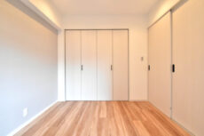 LDKと同じ南東向きバルコニーに面したお部屋です。柱などの出っ張りのない綺麗な形だからでしょうか、数字以上に広く感じます。加えて入口にデッドスペースのできない引き戸を使用しているので、家具のレイアウトもしやすいと思いますよ。間接照明やストーン調のアクセントなど雰囲気作りもバッチリ!