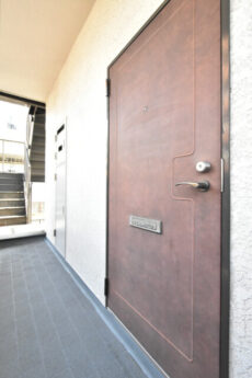 明るい外廊下をお部屋に向かいます。途中と突き当りに外階段。非常時を考えると二箇所にあるのは嬉しいですね。