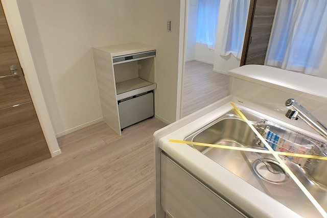 キッチンの横の壁際にキッチン家電を置く感じになるかと思います。自分だったらどんな家具を置くか・・・色々シュミレーションしてみてくださいね(*´▽`*)