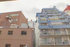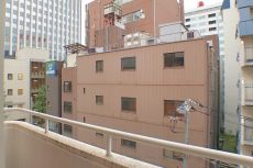 正面の眺望です。エントランス前の通りをはさんでビルやマンションが立ち並ぶ風景です。向かい側は多少距離があるので圧迫感などは感じません。