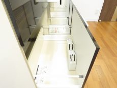 ミラーの隣にはビルドインタイプの収納が付いています。