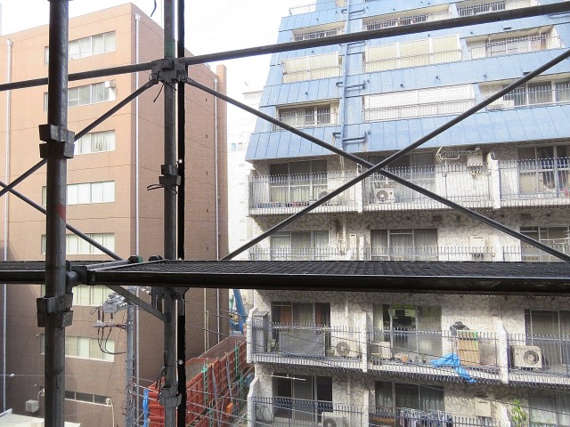 正面の眺望です。修繕工事中なので足場が組んでありますが、雰囲気だけ伝われば幸いです。エントランス前の通りをはさんでマンションなどが立ち並ぶ風景です。