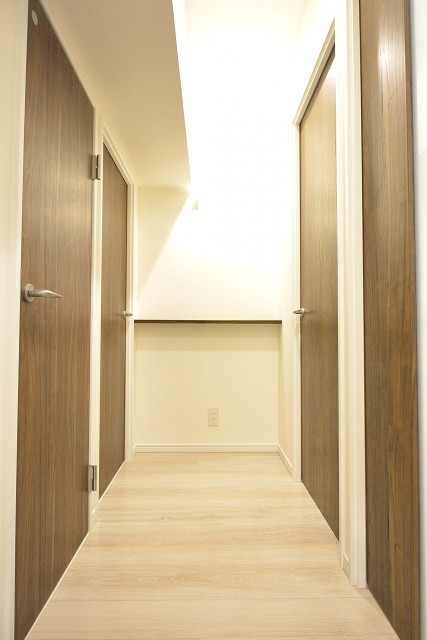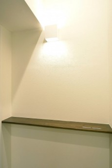 廊下の突き当たりにはちょっとインテリアや小物を飾っておけるくらいのカウンターも設置されていました。置く物でグッと空間の雰囲気も変わりそうですね。