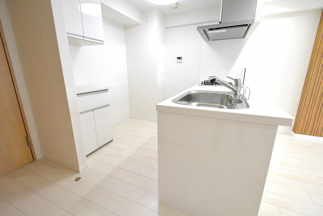 開放感のあるオープンキッチンでキャビネットも設置されています。
