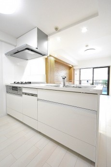 キッチン設備は三口ガスコンロ、グリル、浄水器一体型水栓や食洗機も付いていて充実しています。