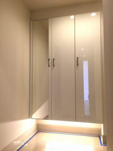 光沢のあるホワイトの扉が魅力のシューズボックスは天井の高さまであり大容量です。便利な可動棚なので、お持ちの靴の大きさに合わせて動かしてみて下さい(^o^)扉には大きな姿見があるのでお出かけ前のチェックもバッチリです♪