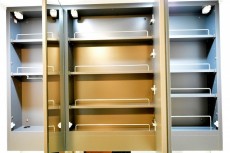 三面鏡の裏は収納になっていますので、化粧品から整髪料、ドライヤー、髭剃りまで、