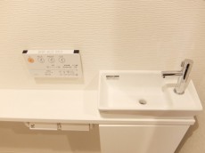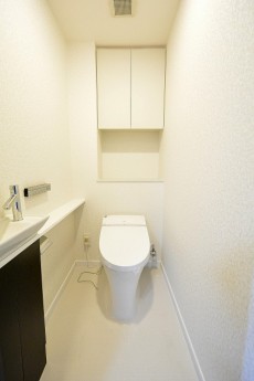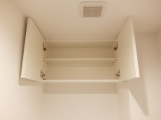 上部には吊戸棚が設置してありますので、トイレットペーパーや洗剤などで煩雑になりやすいトイレもきれいに保てます。