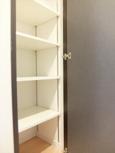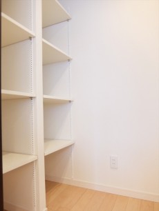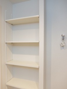 洗濯機置場の横にも棚があります。ここには洗剤やタオルなど、ボックスを置いて下着やパジャマを入れてもGood(*^。^*)