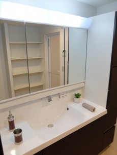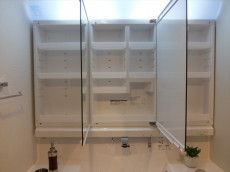 大きな洗面台の三面鏡の裏は収納になっています。