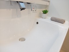 清潔感のあるホワイト基調のバスルーム。