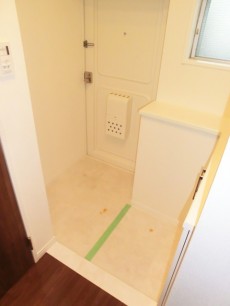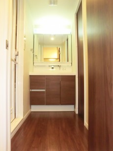 玄関をあがると目の前に廊下がまっすぐ伸びています。右側に洗面室、左側が収納、正面の扉がLDKです。手前から順番にご紹介いたします。
