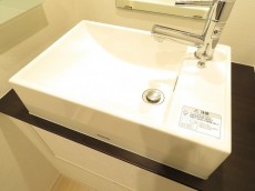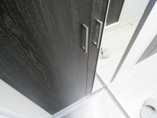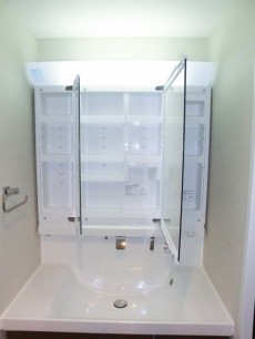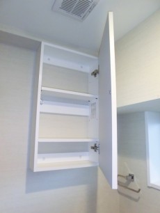 洗面化粧台の横にはキャビネットが設置されており、コスメや水廻りで使うアイテムもスッキリ収納しておけます。