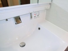 フローリングの床が珍しい洗面室。洗面化粧台の水栓には、節水効果のある