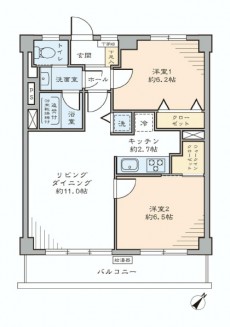 ここで間取りのご紹介。57.60㎡、2LDKにウォークインクローゼットついています。
