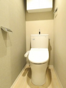 トイレはウォシュレット付き。ペーパーのストックは上の吊戸棚へどうぞ。