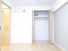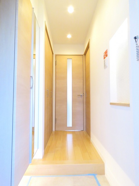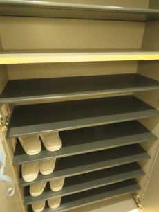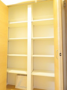 廊下を進んで左側には棚付きの大きな物入れが設置されています。