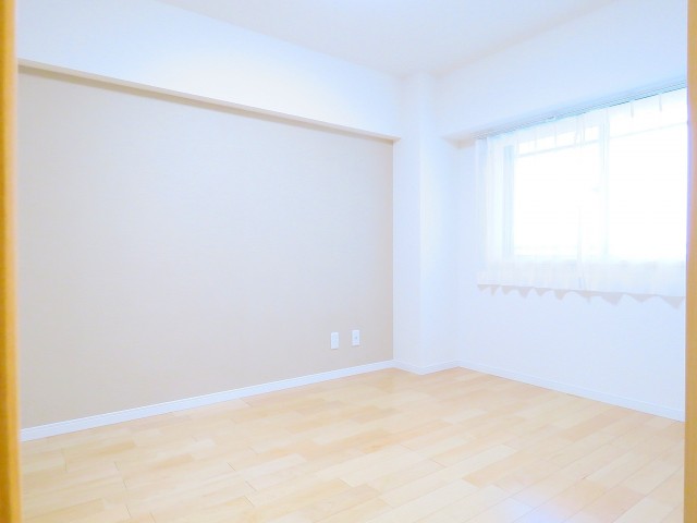 物入れの向かい側は洋室約5.4帖。壁面の一部にやわらかい色合いのカラークロスが使われています。