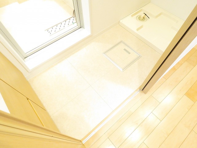 洗濯機置場の上には吊り棚がついているので洗剤類はこちらへ。足もとも散らからずに済みそうです。