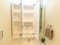 洗面化粧台は鏡の裏が一面収納になっており、ゴチャゴチャ散らかりがちな水廻りの小物も整理して仕舞っておけます。洗面ボウルはお掃除しやすいカウンター一体型。