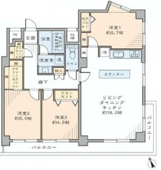 玄関正面突き当りの洋室からLDKまでL字にある11㎡のバルコニーです。L字型ですが、洋室2つとリビングの3部屋から行ける広い方が使えるようになっています。