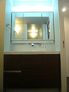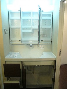 洗面化粧台です。ワイドにあり余裕をもって使えそうです。三面鏡もみやすく扉を開けばもちろん収納!ゴチャゴチャしがちな洗面台もスッキリですね。