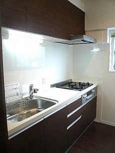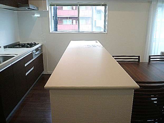 ゆったりとした窓のあるキッチンは人工大理石トップとなっています。使い勝手の良さそうなシンクでは大きなお鍋もゴシゴシ洗えそう!調理スペースも十分にあり料理もスムーズに進みそうです。収納はキッチン以外にも!振り向くとカウンターがあります。こちらもビックリ!