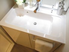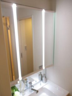 真っ白で清潔感のある洗面台は、大きな鏡が魅力的☆鏡と鏡の間にライトが設置されています。鏡の裏が収納になっているので、散らかりがちな洗面スペースも綺麗に保つことができそうです。ホワイトの洗面ボウルがステキな雰囲気♪♪