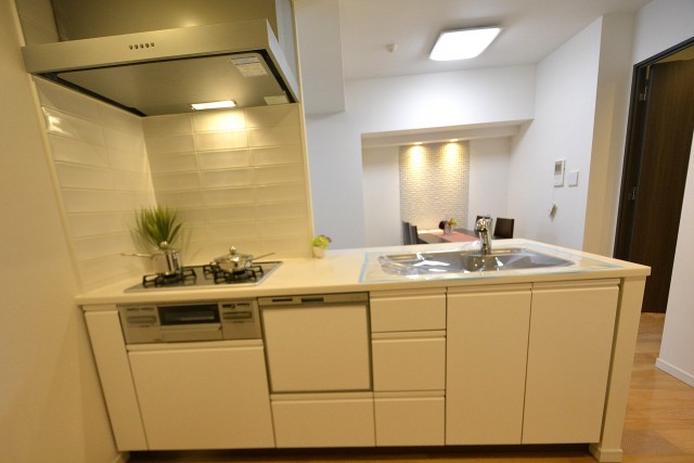 お料理好きには、嬉しいグリル付き3口コンロ♪ コンロの所の壁タイル貼りになってます。