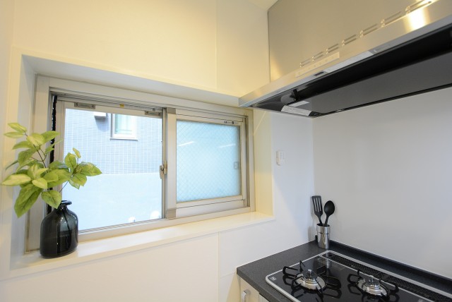 キッチンはコンパクトかつ機能的なデザイン。換気用の窓の下には小さなカウンターがありますので、いといろと重宝しそうです(^v^)