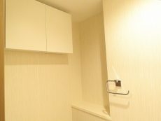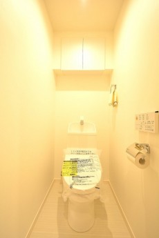 トイレはウォシュレット付きで吊戸棚も設置されています。
