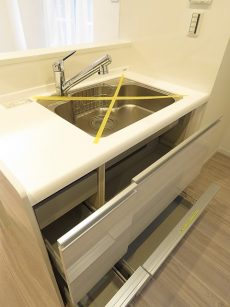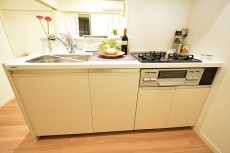 設備は3口ガスコンロ、浄水器一体型水栓などが付いています。