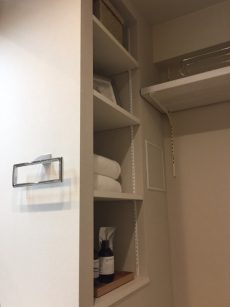 奥の洗濯機スペースは上部に収納棚があり、洗剤や洗濯物カゴなどを置いておく事が出来ます。高さも調節可能なので使いやすい高さに合わせましょう。