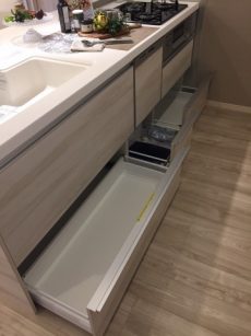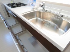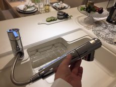 シンクは継ぎ目の無い一体型でお掃除がし易いですよ。水栓も浄水機能付きシャワー水栓なので、シンクの隅々までヘッドが届きます。