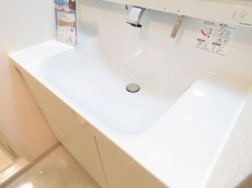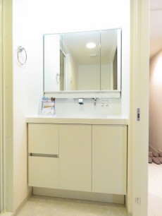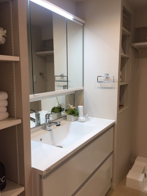 洗面化粧台。鏡の裏、引き出しと小物の収納場所が豊富でゴチャゴチャしがちな水回りもスッキリ片付けられるはず。蛇口はひっぱるとシャワーになります。