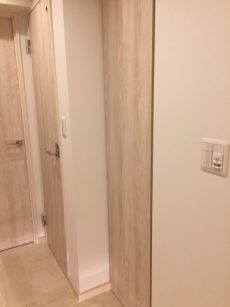 ドアを開けると正面には壁があり、廊下は右方向へ伸びています。このタイプは玄関からお部屋の奥が見えづらくていいんですよ。最近は宅配便やフードデリバリーなどの増加で、玄関を訪ねて来る方も増えましたからね。