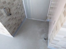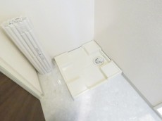 洗面化粧台の向かい側が洗濯機置場。横のスペースに洗剤を置くラックなどを用意するのもよさそうです。