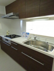 浄水機能付き水栓、3口ガスコンロ、上下に収納たっぷりとキッチンはスペック◎。横に窓があるのでお料理中の熱や匂いが解消しやすいのもポイント高いです。