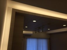 オーソドックスなフローリングやクロスで落ち着いた雰囲気のお部屋に、様々な照明がアクセントをつけています。壁や天井の間接照明、ダウンライト、スポットライトなど、照明に対するこだわりを感じますね。