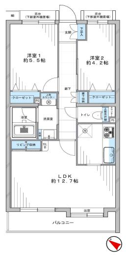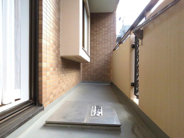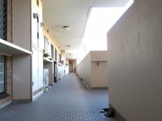 共用廊下は外廊下タイプ。玄関扉の両脇には花台が設けられており、その下に室外機が置けるようになっています。お好みのお花や植物に囲まれて暮らせますね。