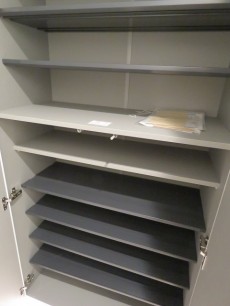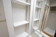 左手側の壁も収納棚になっています。棚板の高さが変えられるので、コスメ用品など高さのあるボトルなどの収納も出来ます。