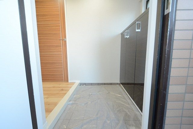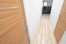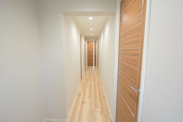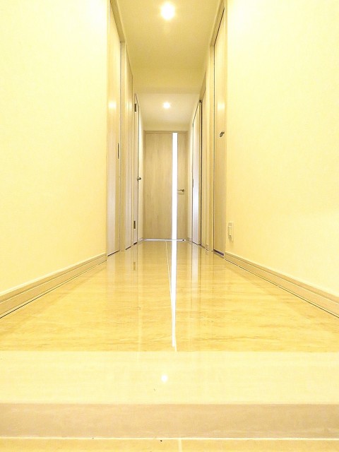 玄関をあがると目の前に廊下がまっすぐのびています。玄関と廊下の段差があまりないので小さなお子様でもスムーズにあがれるかと思います。床はツルリとした質感のタイル貼り。高級感があります。