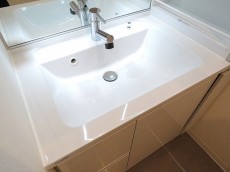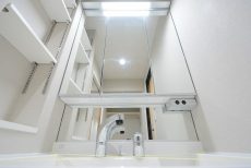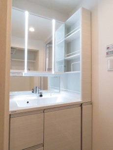 洗面化粧台は鏡の裏、引き出し、横のキャビネットと小物の収納スペースが豊富。 鏡の間にライトが入っており、かなり顔が明るく見えます。