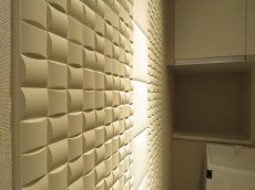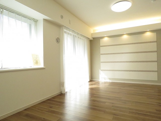 LDKの壁面の一部には調湿・消臭効果のあるエコカラットが使われています。優れた機能面でありながら見た目がおしゃれなのも◎。ダウンライトで照らされてお部屋のアクセントにもなっています。