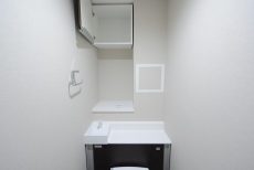 トイレの後ろ側に吊戸棚とカウンターが設けられています。ペーパーのストックや小物類はこのあたりにどうぞ。