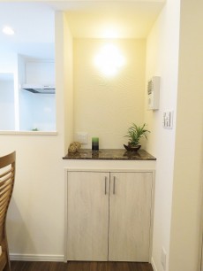 LDKの扉手前の壁面部分にも玄関ホールと同じテイストのニッチがつくられていました。飾りたい物がたくさんある方にはうれしいですね。高さのあるフラワーベースを並べたり、季節によって飾る物を変えたりと、毎日の暮らしが一層楽しく送れそうです。