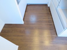 玄関をあがると廊下が左方向へまっすぐのびています。廊下はダークブラウンの木目調、建具は白っぽい色合いの木目調。落ち着いた雰囲気です。玄関側から順番にご紹介いたします。