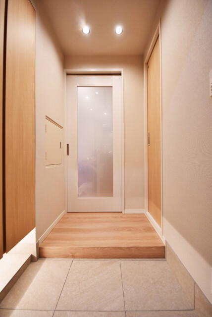 落ち着いた雰囲気の玄関廊下は、限られたスペースをなるべくお部屋に割けるようコンパクトにレイアウトされています。日中はガラス越しにお部屋の窓からの光、暗くなれば人感センサーによって照明が玄関を明るく照らしてくれます。